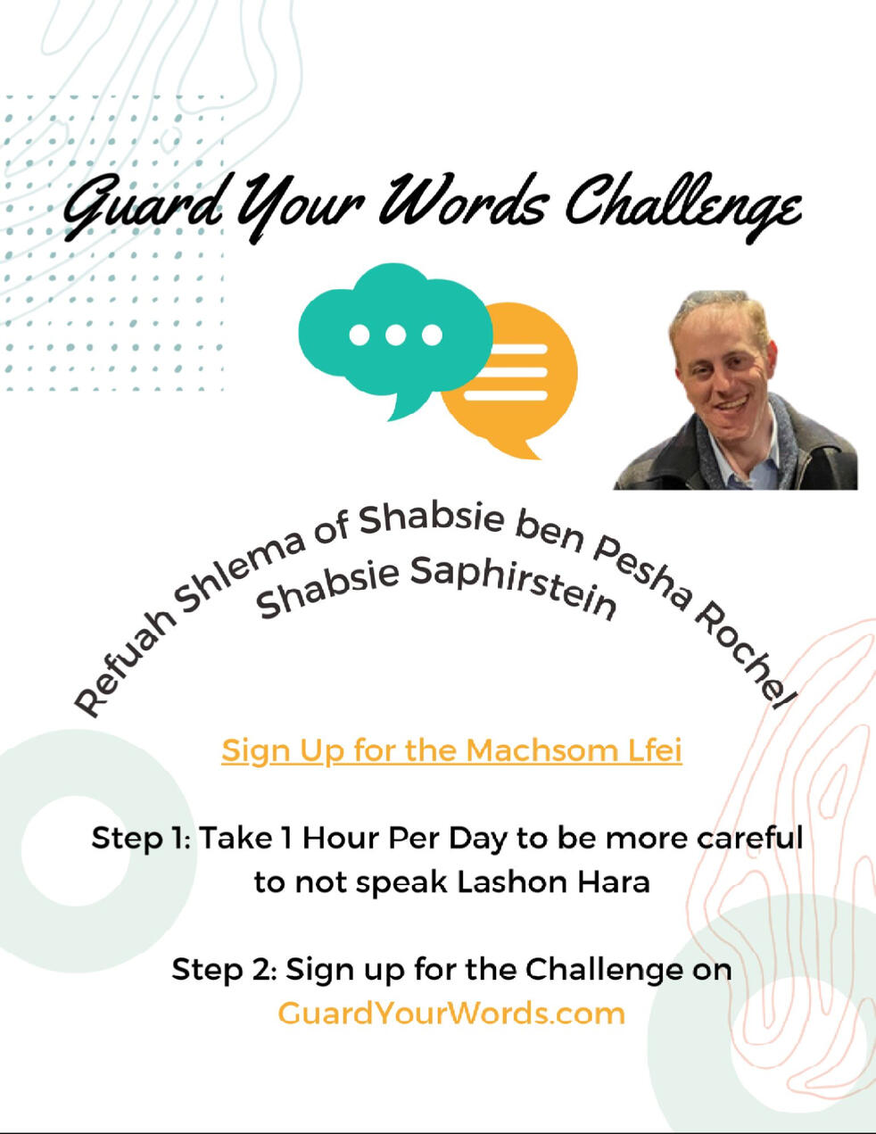We are launching a program as a Zchus Refuah Shleimah for Shabsie Ben Pesha Rochel called “Guard Your words” Lashon hara is a challenge and struggle that we all go through and if we focus one hour a day not to speak lashon hara and guard our words, it should be a tremendous Zchus for a Refuah Shleima.